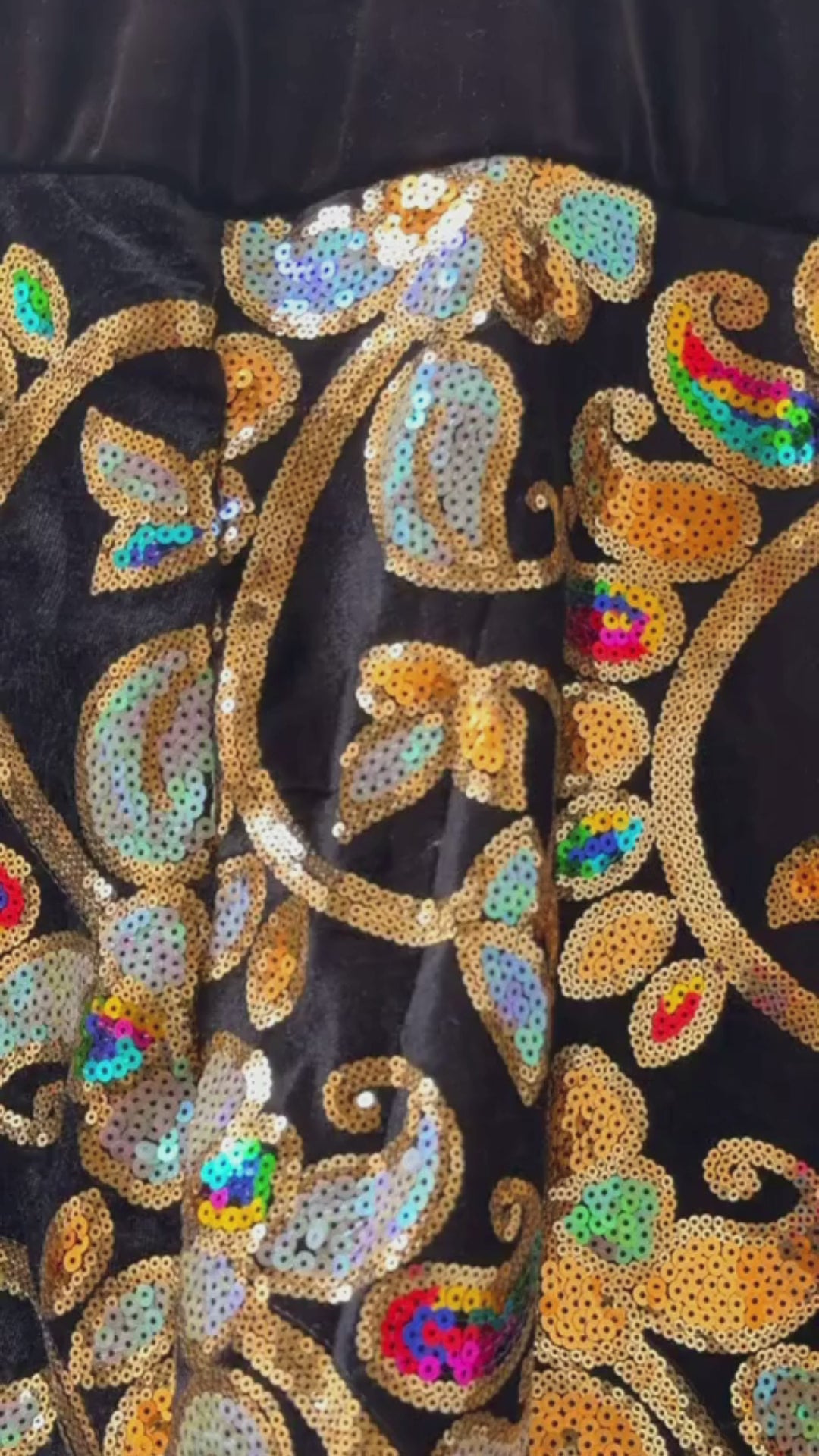 A black velvet dress with hand-embroidered detailing across the sleeves in rich gold and multicolor accents. Made for Ramadan evenings, iftar gatherings, and special night occasions.